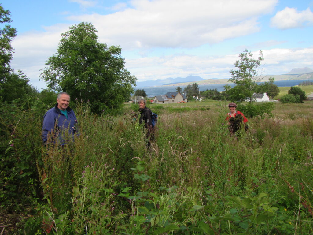 As the catchment is made up of a myriad of tiny ditches and streams running through private gardens, crofts, common grazing and a community woodland, a cross-community approach was developed over the course of 2020 and 2021 to control the plant from multiple locations. This was led by Skye and Lochalsh Rivers Trust, the delivery partner of the Scottish Invasive Species Initiative in the region.