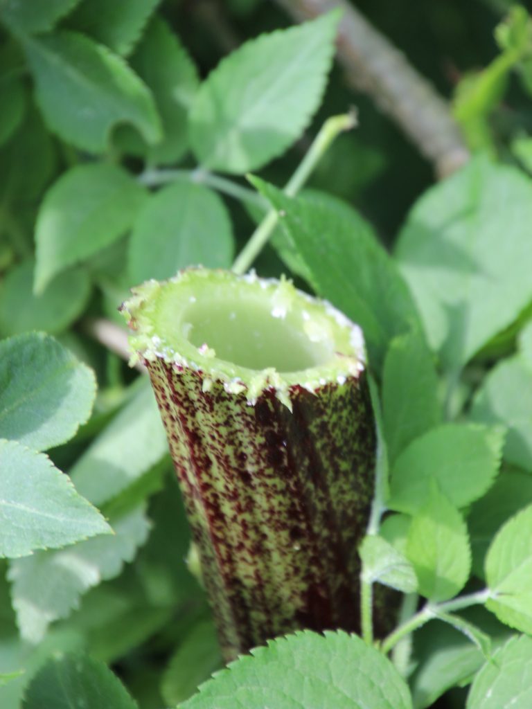 Description: Giant hogweed is an umbellifer (member of the cow-parsley family) with long flowering stems, typically 2-3m in height. The umbrella-shaped flowers are large (up to 80cm across) with white or pinkish flowers. It has jagged leaves with serrated edges and the stems have sharp bristles and purple blotches.