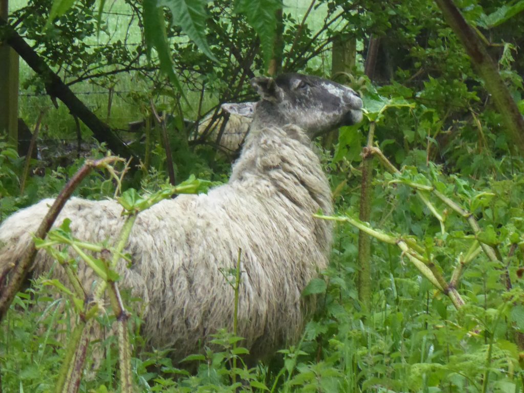 Blackface and Greyface sheep have mostly been used in these trials. The dark skin pigmentation of Blackface sheep may help resist the photosensitivity impacts of giant hogweed sap. During the trials there was no evidence of adverse effects on the sheep from their giant hogweed diet. The sheep were inspected regularly by the land manager and in early trials they were examined by a vet at least twice a year. Wethers were used as these could be moved wherever and whenever needed to combat giant hogweed.