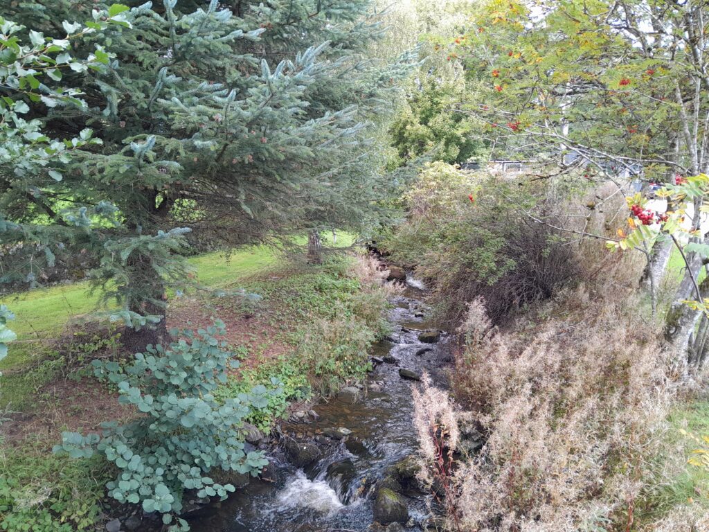 The Moulin Burn runs close to the A924 road above Pitlochry but is largely hidden behind gardens, aside from a small area where it runs through a playground. Within Pitlochry, the burn is heavily modified in sections and passes through areas of concrete and natural channel.