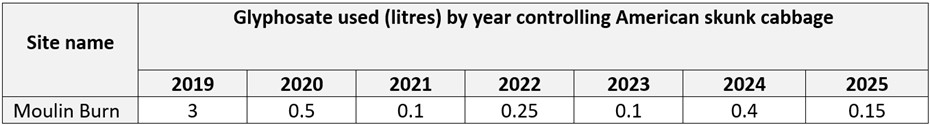 Table 4 – Volume of glyphosate used to control American skunk cabbage (2019 – 2025) at Moulin Burn