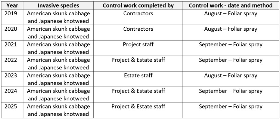 Control work was undertaken by contractors in 2019 and 2020, with project staff and/or estate staff completing control work thereafter.