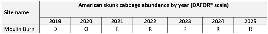 Table 2 – Annual American skunk cabbage abundance from surveys (2019 – 2025) at Moulin Burn