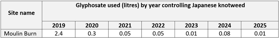 Table 5 – Volume of glyphosate used to control Japanese knotweed (2019 – 2025) at Moulin Burn