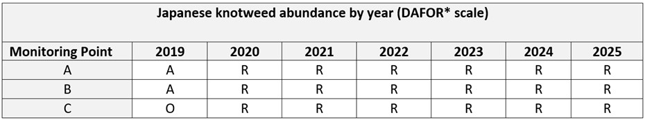 Table 3 – Annual Japanese knotweed abundance from surveys (2019 – 2025) at Moulin Burn