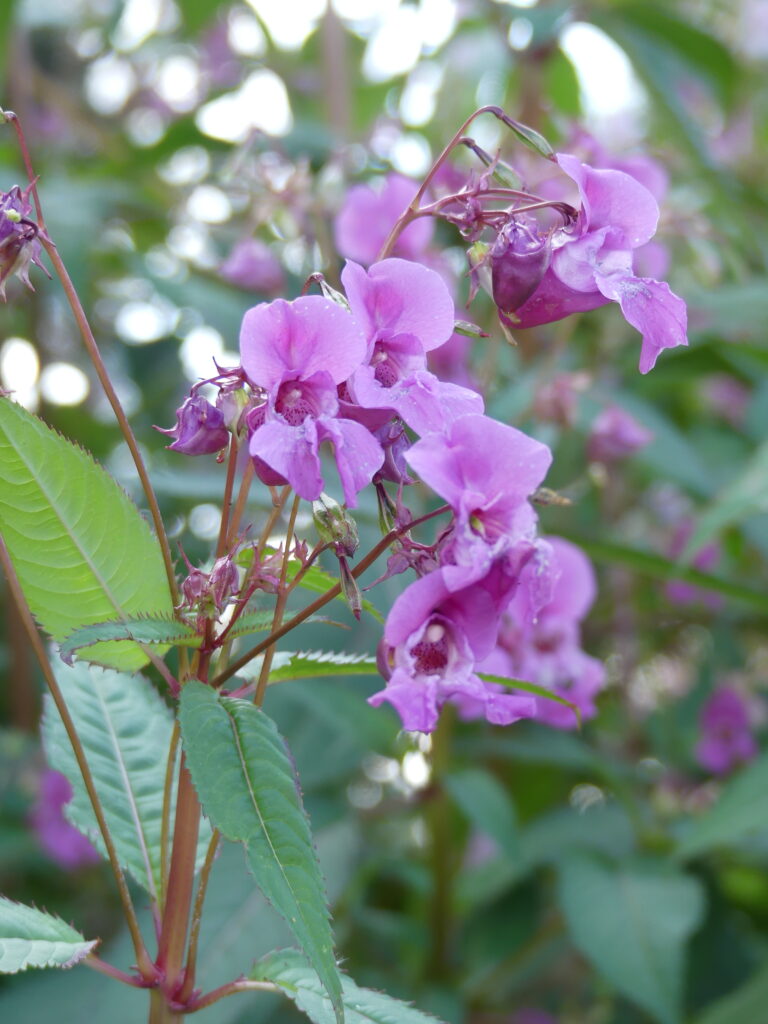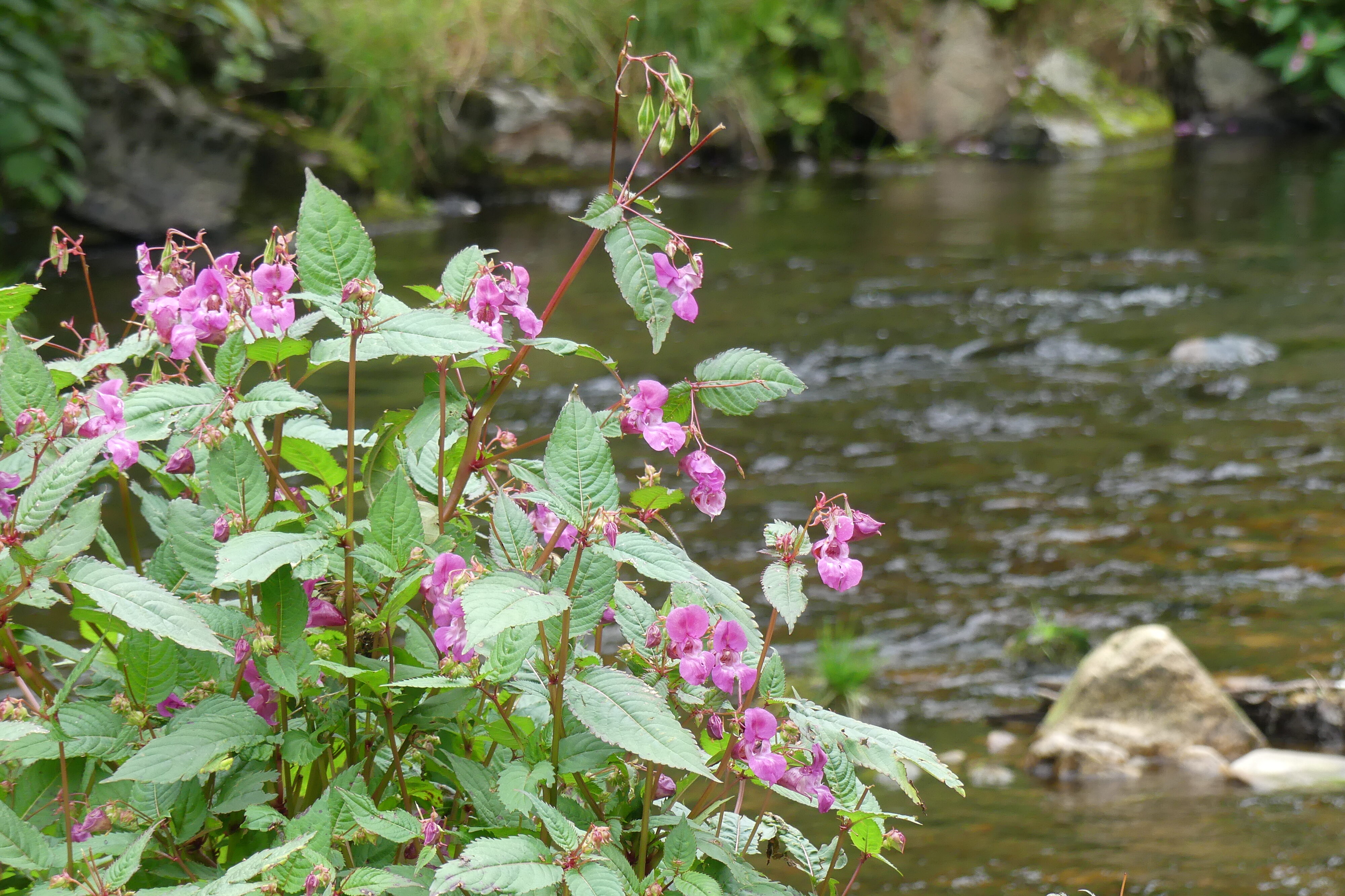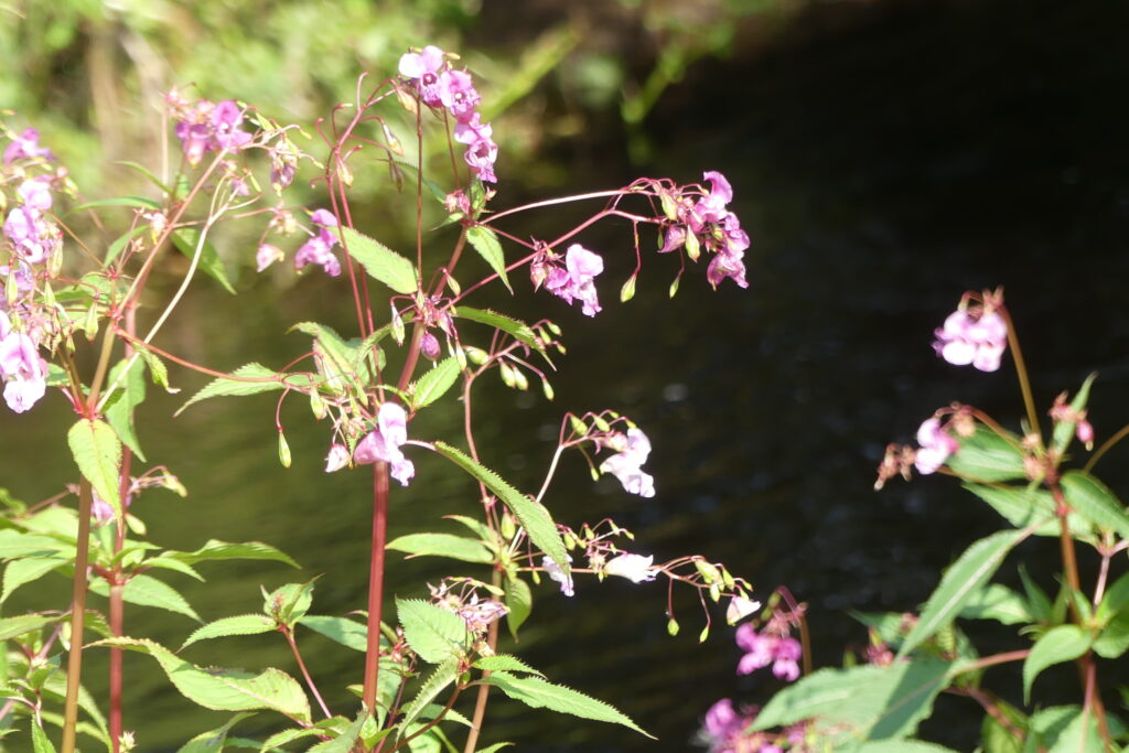 Himalayan balsam is a prolific invasive non-native species in Scotland. It grows in dense stands, shading and crowding out native plants, and spreads readily along rivers and waterways where the seeds are carried along and spread by the current.